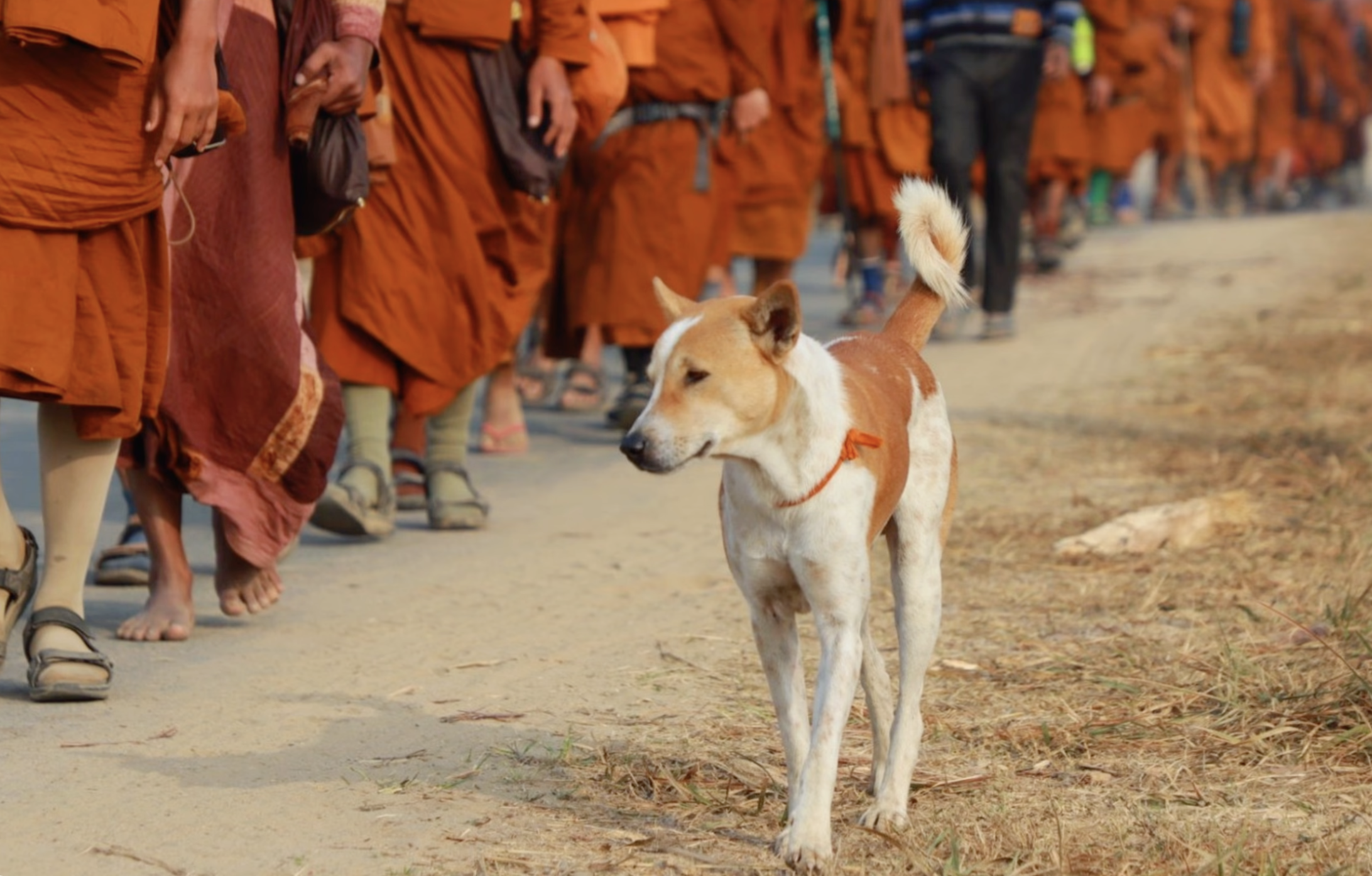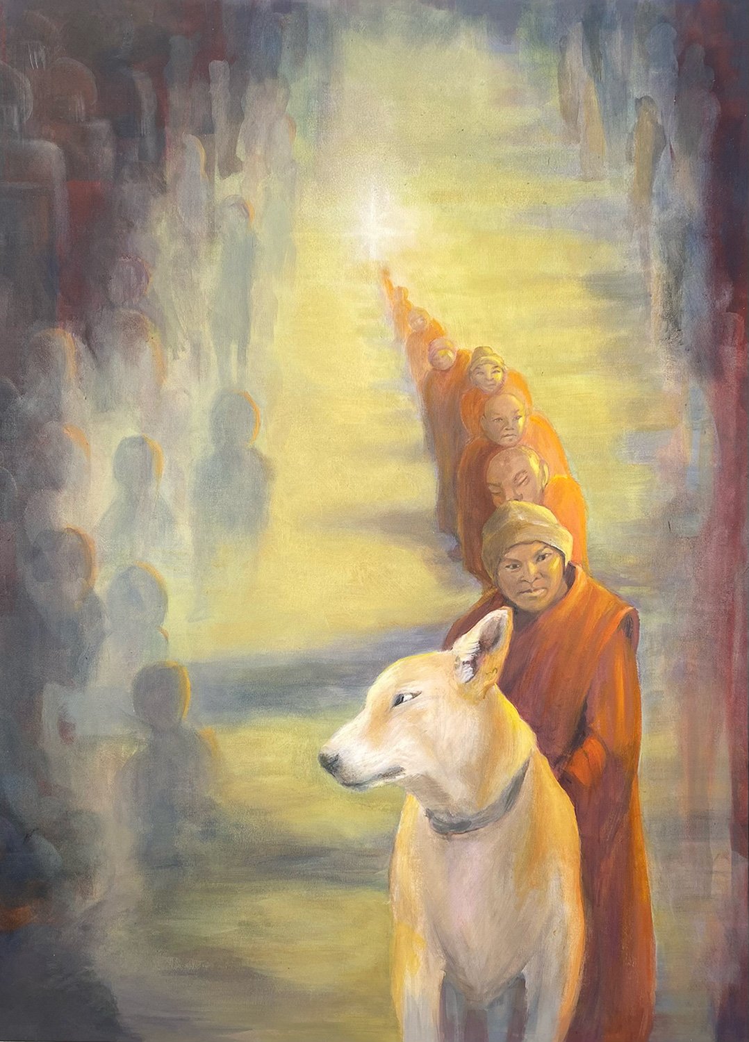 During a peace walk in India, a small street dog began following a group of Buddhist monks. Many stray dogs came and went, but this one stayed. When the monks brought her to America, they adopted her and named her Aloka, a Sanskrit word meaning light. Soon known as the Peace Dog, she joined them on their 2,300-mile Walk for Peace from Texas to Washington, D.C., bringing attention to compassion, peace, and care for all living beings. As the walk moved across the country, Aloka quickly became a focus of attention. Walking quietly beside the monks, she embodied the spirit of the journey. Thousands followed along online, drawn to the calm steadiness of the walk at a time when the daily news was overwhelming. Checking in on the walk each day, the artist felt the hope moving forward step by step. That feeling eventually became The Peace Walk. In support of the monks’ Aloka Foundation for Animals, a special fundraiser connected to The Peace Walk offers supporters the opportunity to receive an archival print of the painting.